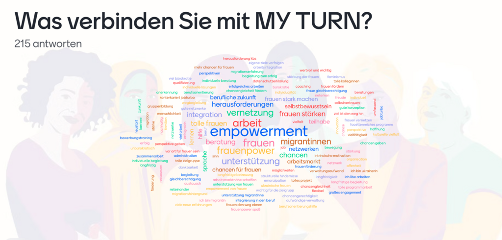 Das Programm hat sich zum Ziel gesetzt, bis Ende 2025 insgesamt knapp 30.000 Frauen aufzunehmen und individuell zu unterstützen. Die erste Bilanz zeigt: Das Interesse der Zielgruppe am Programm ist groß und die Projekte sind auf einem erfolgreichen Weg! Nach einer Implementierungsphase werden aktuell knapp 14.000 Frauen durch die 65 MY TURN-Projekte begleitet. Das Besondere: MY TURN ist auf eine langfristige Begleitung ausgelegt, so dass eine intensive Betreuung entsprechend den persönlichen Bedarfen der Teilnehmerinnen möglich ist. Es ist kein fester Austrittszeitpunkt aus dem Programm vorgegeben, dieser orientiert sich am Entwicklungsstand der Teilnehmerinnen. Die ersten Ergebnisse: Aktuell haben 20% der aufgenommenen Frauen die Projekte wieder verlassen. Sie wurden durch Empowerment, individuelle Beratung und Kompetenzentwicklung gestärkt und sind u.a. in Ausbildung, Beschäftigung oder Qualifizierung eingemündet.